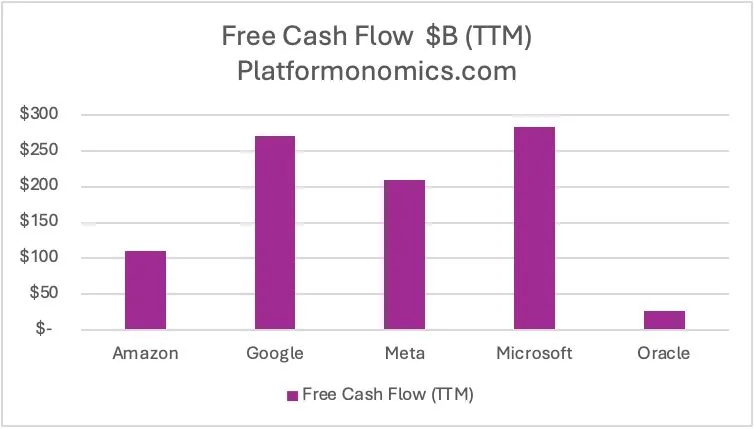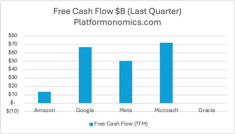 Bar chart comparing free cash flow in billions of dollars for Amazon, Google, Meta, Microsoft, and Oracle for the last quarter.