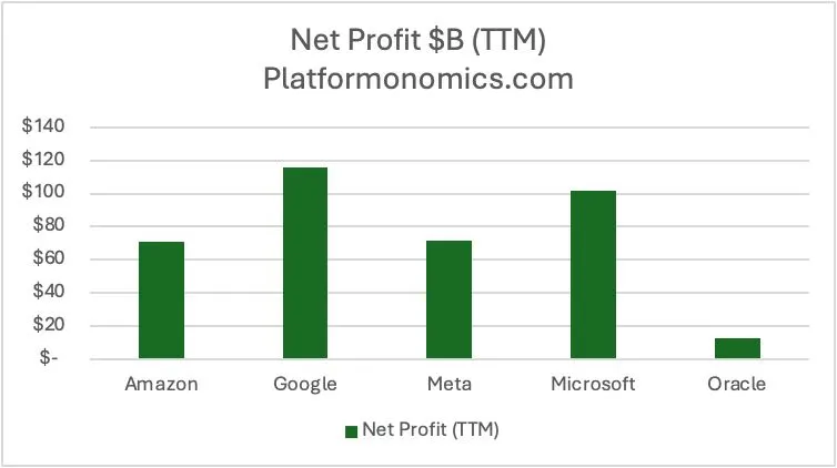 Bar graph comparing the net profit in billions of dollars for Amazon, Google, Meta, Microsoft, and Oracle, highlighting Oracle’s significantly lower profit.