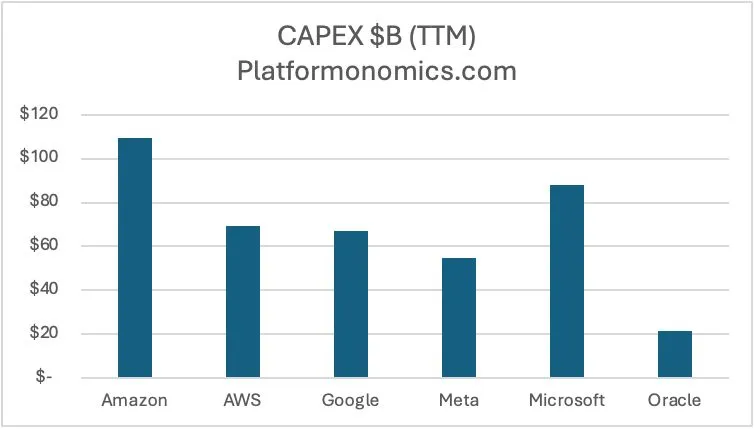 Bar chart comparing CAPEX spending in billions of dollars for Amazon, AWS, Google, Meta, Microsoft, and Oracle over the last twelve months.