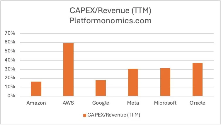 Bar chart comparing CAPEX to Revenue ratios of Amazon, AWS, Google, Meta, Microsoft, and Oracle over the trailing twelve months.