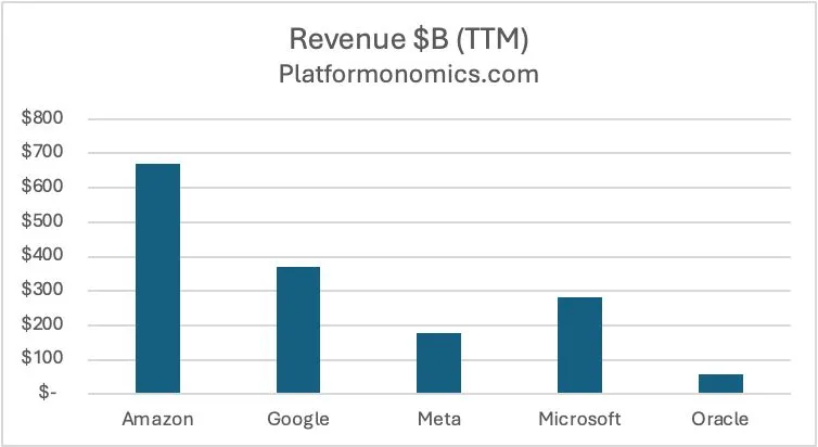 Bar chart comparing revenue in billions of dollars for Amazon, Google, Meta, Microsoft, and Oracle over a trailing twelve months period.