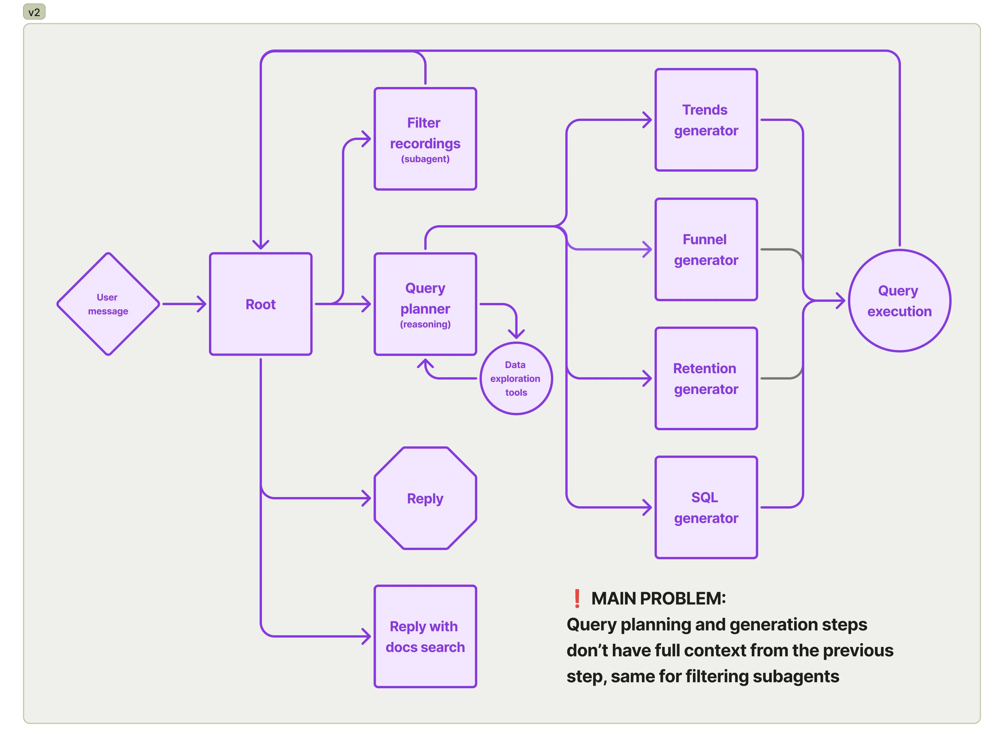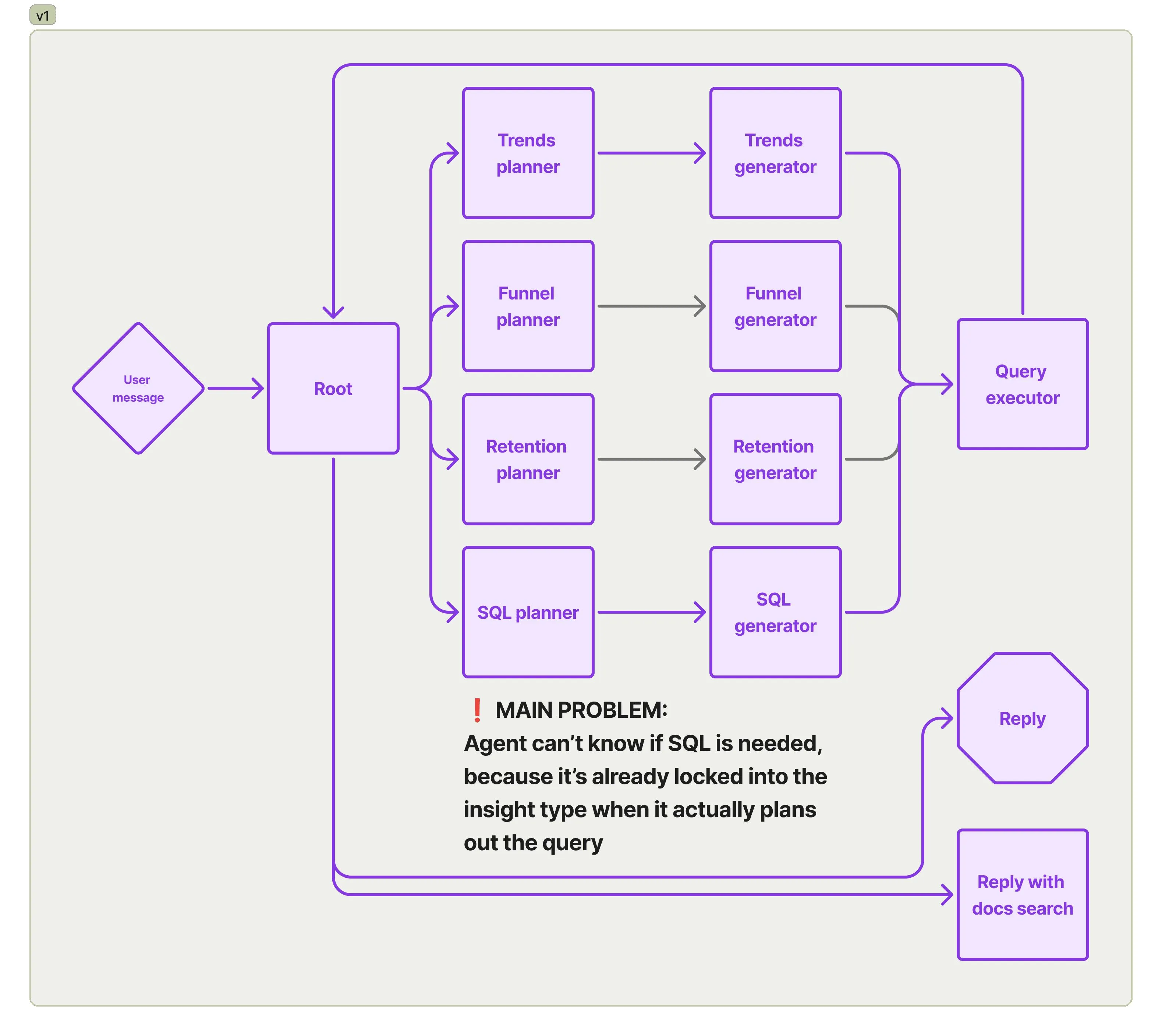 Section titled “2. Agents Beat Workflows”Graph-style workflows seemed like the right choice for getting work done. In the GPT-4o era, calling tools in a loop with the same system prompt was a recipe for confusion, and so we’ve spent months chasing new graph-based ways of orchestrating tools. Just look at the architecture iterations we’ve cycled through, back when our assistant was a hedgehog named Max. The initial one couldn’t even answer questions with text, it could exclusively create queries, whatever the user input was!