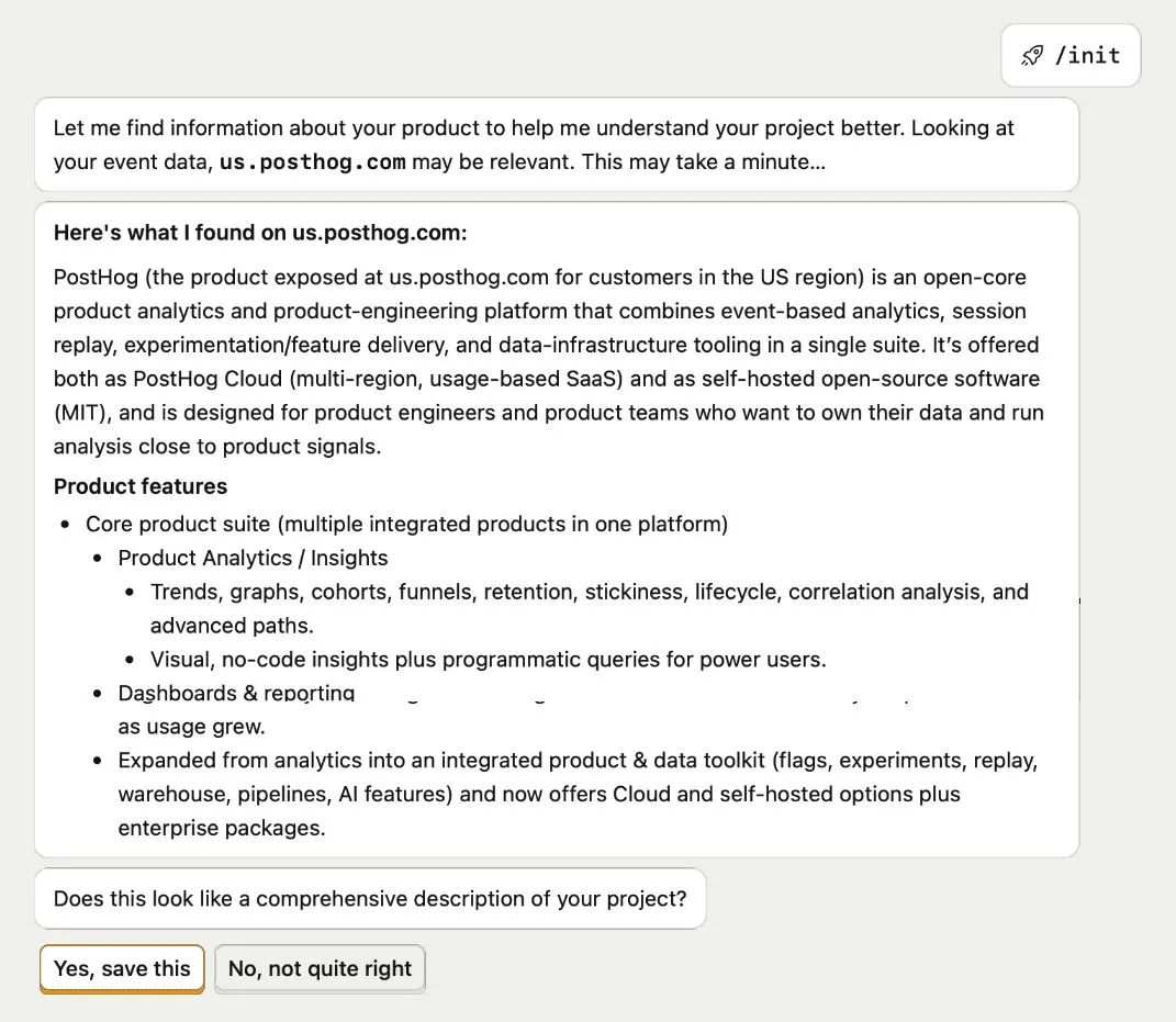 In PostHog AI, /init learns about your product and business via multi-step web search (currently using GPT-5-mini). The results form the agent’s project-level memory. In the case your data doesn’t contain URLs to work with, a few questions are asked directly, but it’s something we try to minimize.