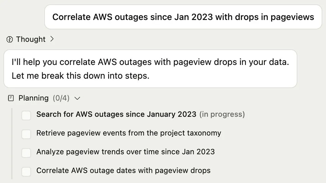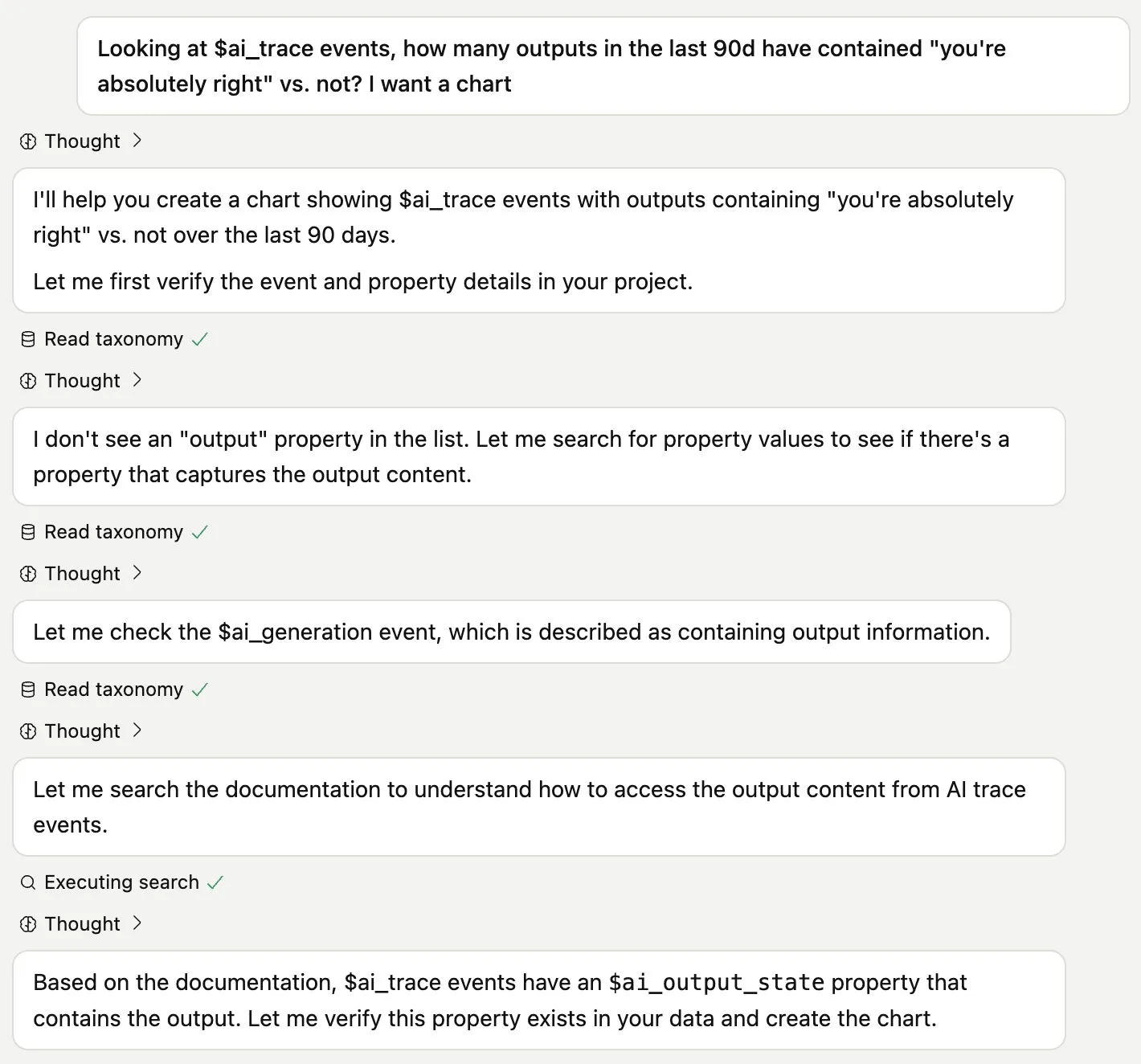 PostHog AI has since started streaming every tool call and reasoning token. It turns out humans are like LLMs – or maybe it’s the reverse. A black box is uninspiring no matter how good the results are. Details give us confidence in what’s happening. Show it all, the good, the bad, the ugly.