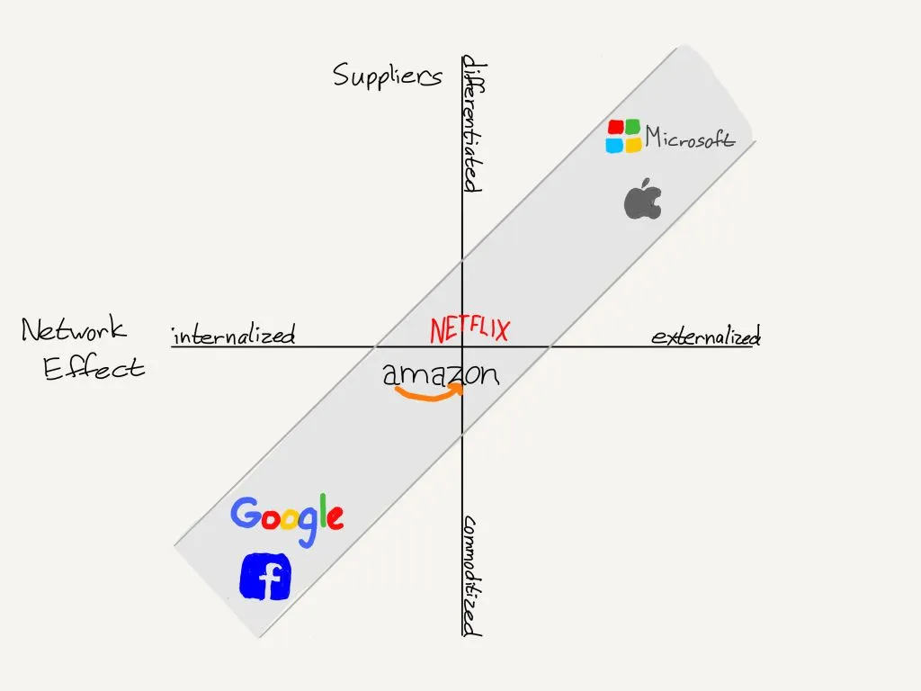 This is certainly one of the simpler charts I’ve made, but it’s not the first in the moat genre; in 2018’s The Moat Map I argued that you could map large tech companies across two spectrums. First, the degree of supplier differentiation: