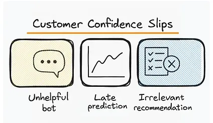 Section titled “Customer Trust Erosion”When AI touches customer-facing experiences, the stakes are even higher. A chatbot that can’t solve real problems, a recommendation engine that gets it wrong, a predictive alert that triggers too late: all of these chip away at user trust. In some industries, that erosion isn’t just reputational, it’s regulatory.