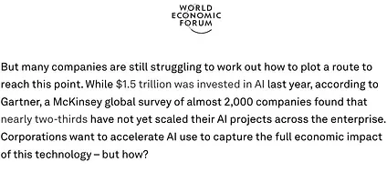 Unsurprisingly, many firms’ AI adoption journey starts with technology and data. ” AI has been a catalyst for companies to really look at their technology,” said Julie Sweet, Chair and Chief Executive Officer of Accenture, with many companies investing in data too. ” The companies that have done this early, like Saudi Aramco – or McDonald’s, which created its data foundation very early – are surging ahead in how they’re using it.”~ Part of World Economic Forum Annual Meeting