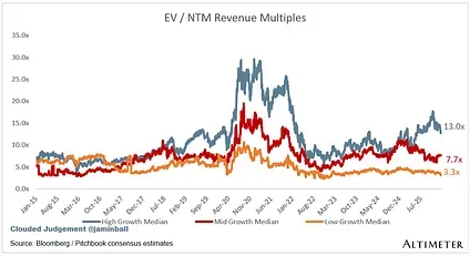 SaaS businesses are generally valued on a multiple of their revenue - in most cases the projected revenue for the next 12 months. Revenue multiples are a shorthand valuation framework. Given most software companies are not profitable, or not generating meaningful FCF, it’s the only metric to compare the entire industry against. Even a DCF is riddled with long term assumptions. The promise of SaaS is that growth in the early years leads to profits in the mature years. Multiples shown below are calculated by taking the Enterprise Value (market cap + debt - cash) / NTM revenue.