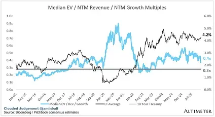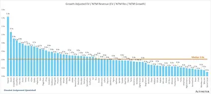 The below chart shows the EV / NTM revenue multiple divided by NTM consensus growth expectations. So a company trading at 20x NTM revenue that is projected to grow 100% would be trading at 0.2x. The goal of this graph is to show how relatively cheap / expensive each stock is relative to its growth expectations.