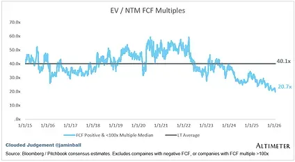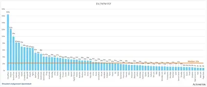 The line chart shows the median of all companies with a FCF multiple >0x and <100x. I created this subset to show companies where FCF is a relevant valuation metric.