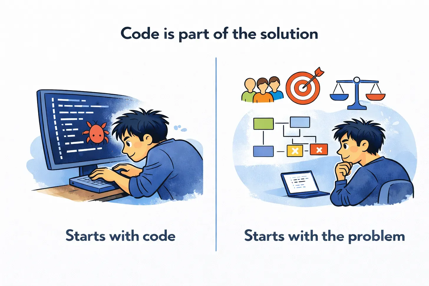 - Why do we default to coding anyway. There is a reason why teams rush into code-first behavior. Incentives, praise, deadlines, and org structure all push it in the wrong direction.
