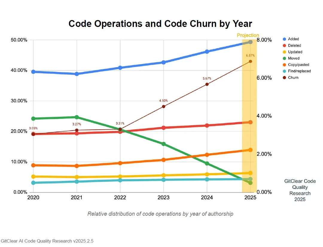 Code Operations and Code Churn by Year by GitClear