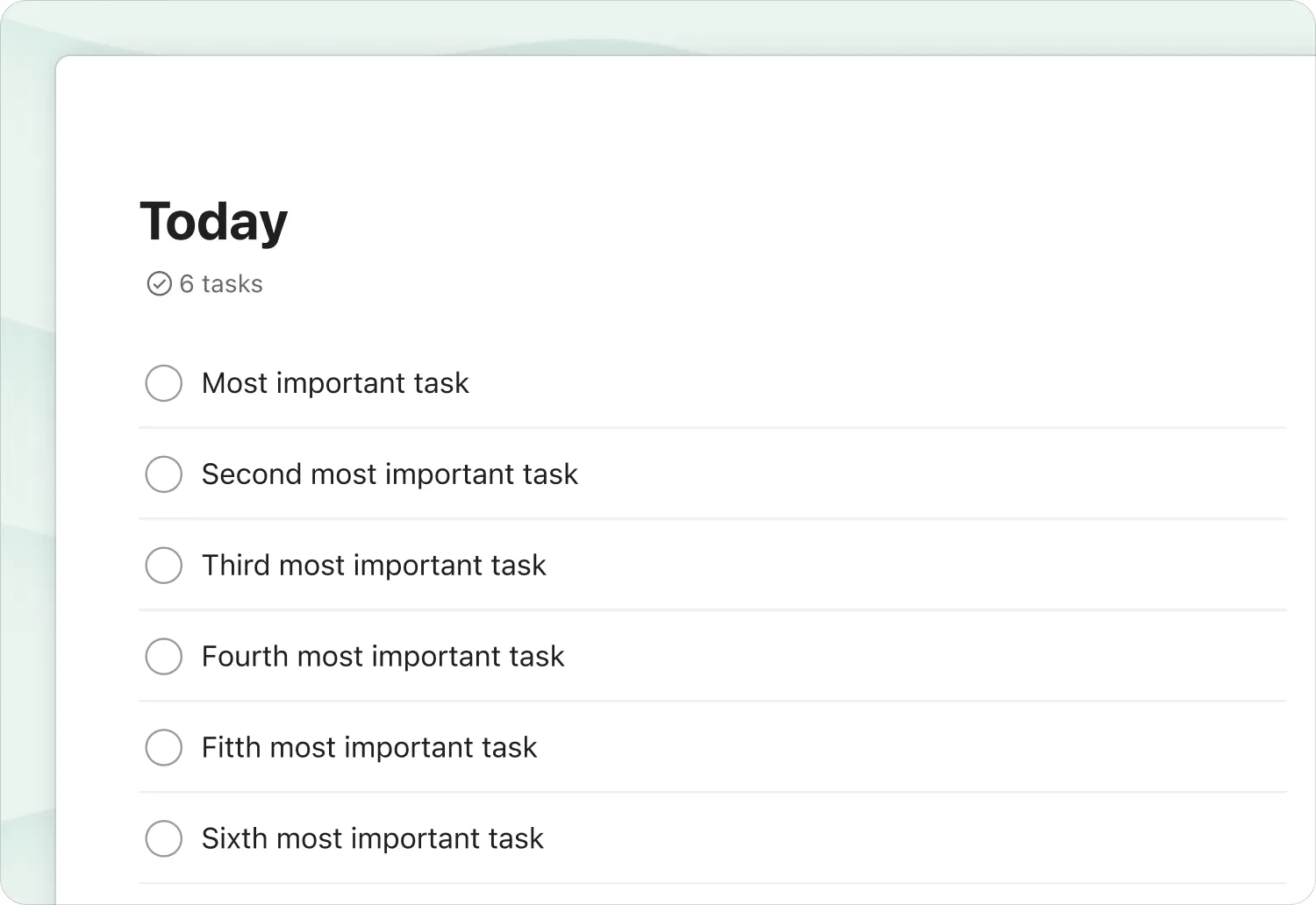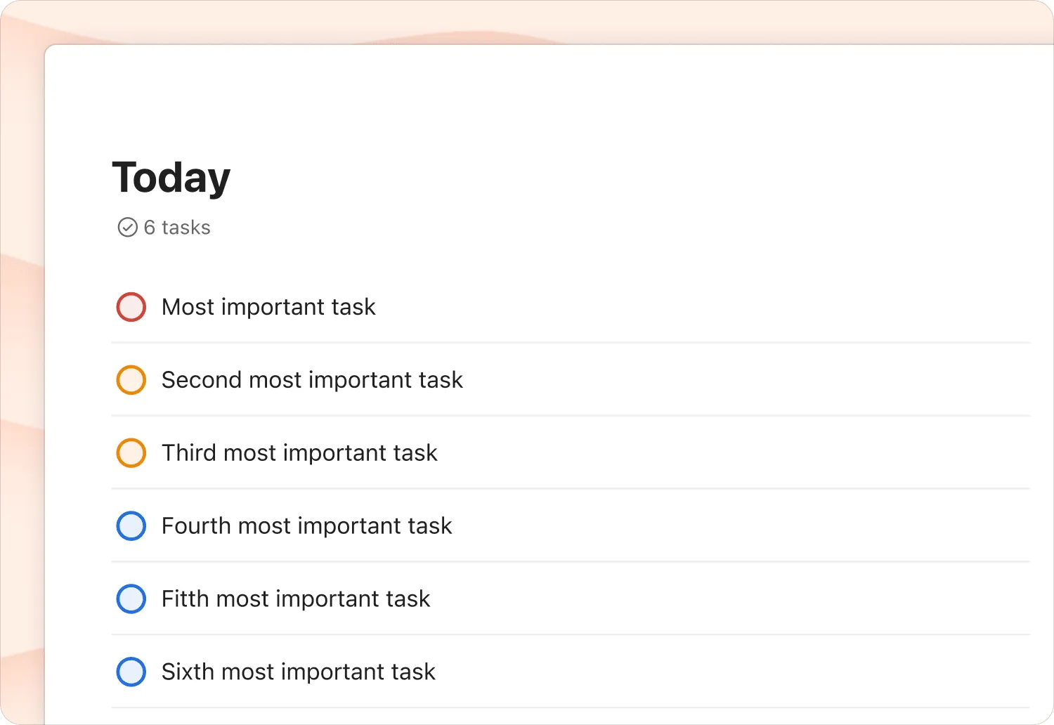 Section titled “Focus on Your top 6 Tasks with the Today view”Keep all tasks that aren’t on your daily list out of sight and out of mind with Todoist’s Today view. This is helpful if you can consistently keep your daily schedule to only your top six tasks.