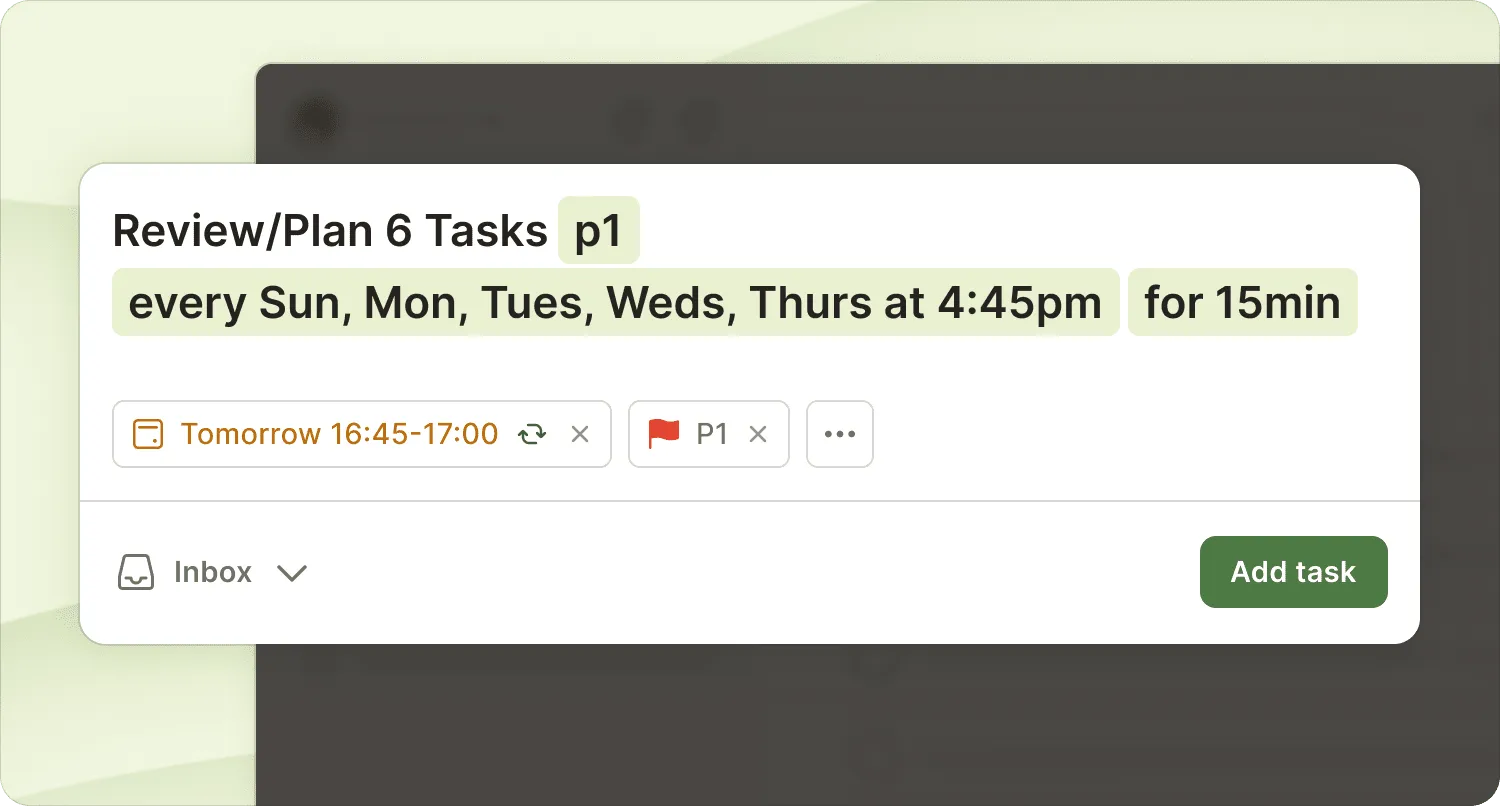 Section titled “Repeat Tasks via Recurring Scheduling”Use recurring tasks to ensure you never forget your daily planning and review session. In Todoist, set a recurring task to plan the next day’s list. Schedule it for the end of your workday. Say, 4:45 p.m., if you typically finish at 5 p.m.