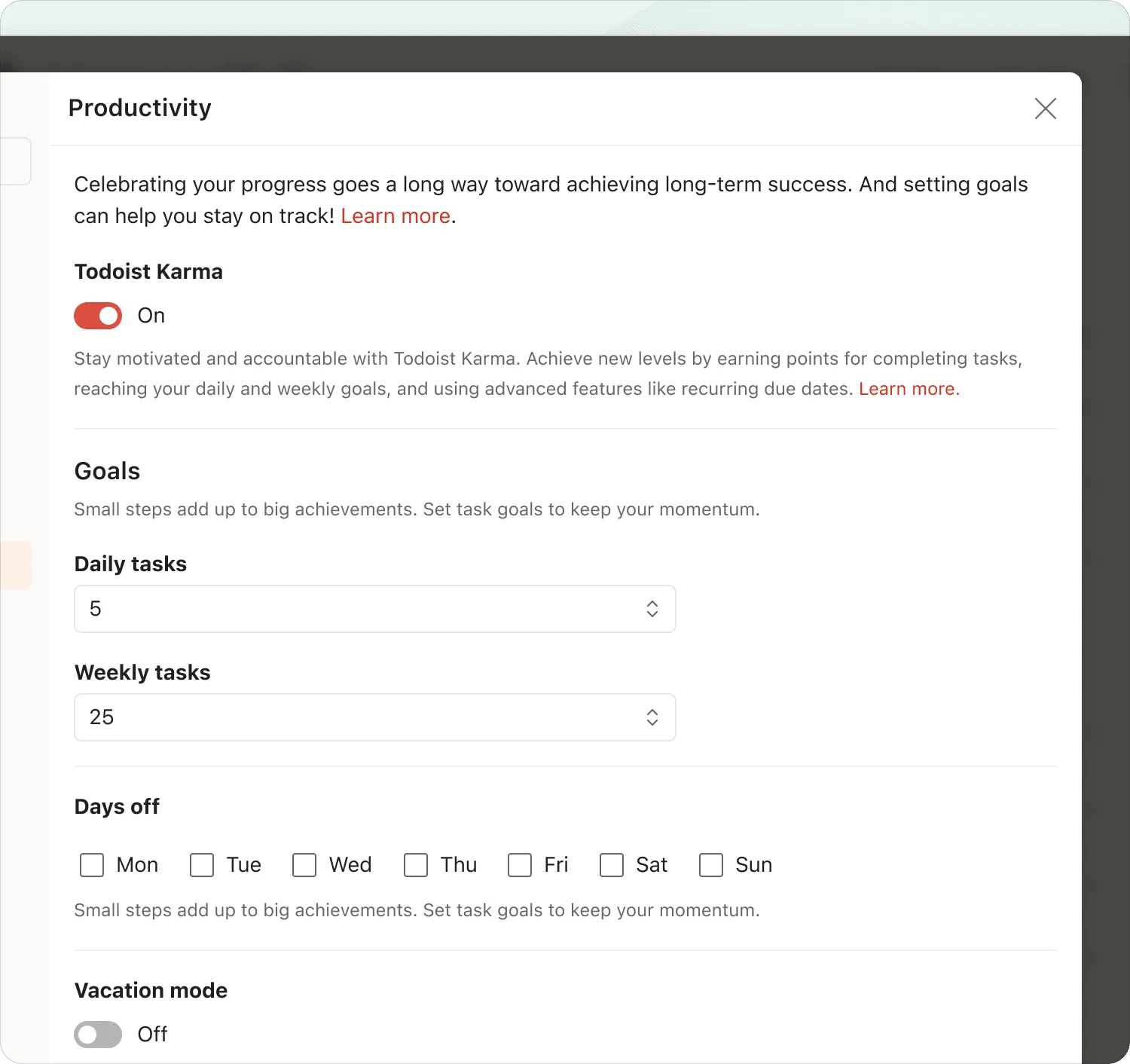 Section titled “Track Completion Streaks to Build Habits”Update Todoist’s productivity settings to reflect the number of tasks you want to complete in a day or week. For example, with the Ivy Lee method, you’ll likely aim for six tasks per day. Make sure to set your days off (e.g., Saturday and Sunday).