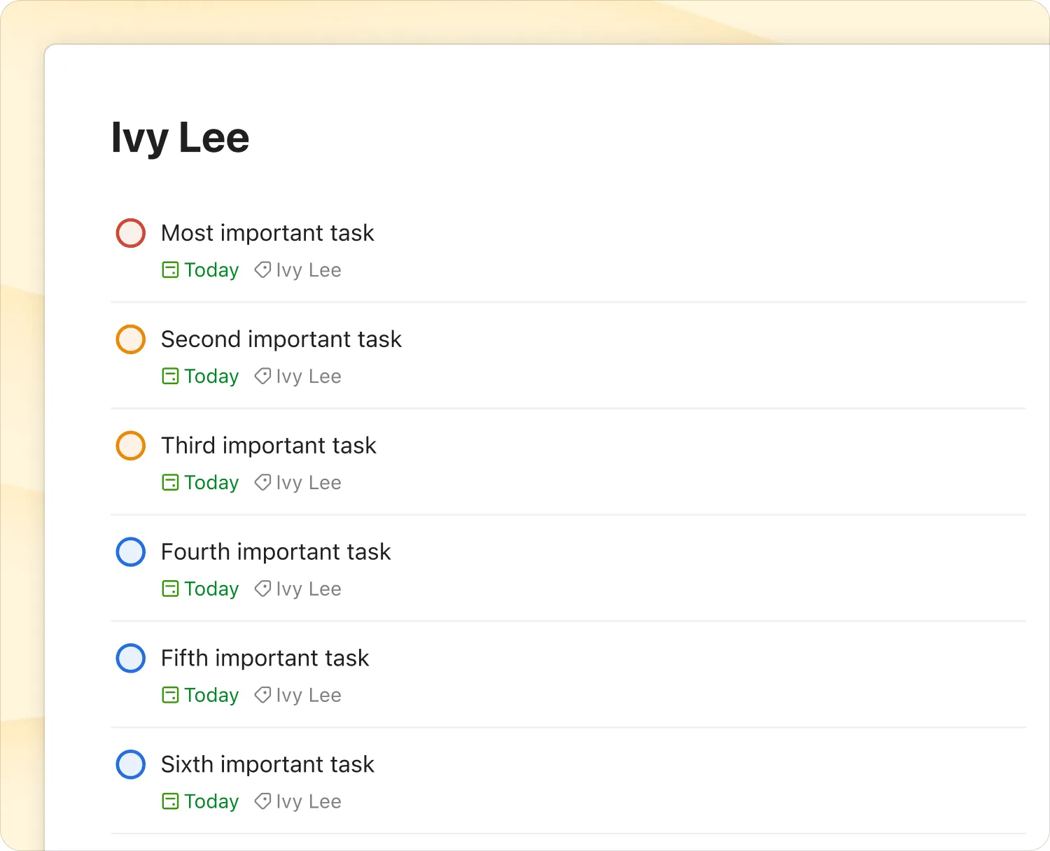 Section titled “What is the Ivy Lee Method?”The Ivy Lee method is a daily planning system that helps you prioritize a shortlist of tasks you need to accomplish each day. It eliminates context switching and multitasking so you can get more done.