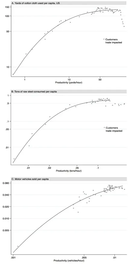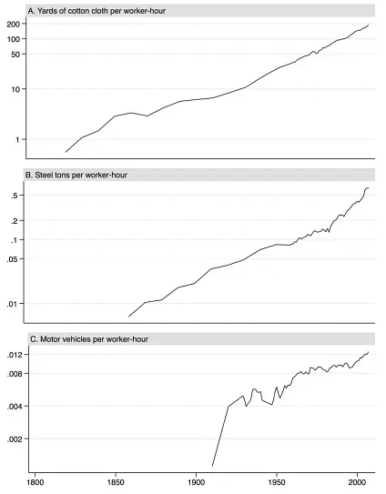 To understand this better, look at what actually happened in three industries over a 200-year period from 1800 to 2000. In the paper Automation and jobs: when technology boosts employment, James Bessen, an economist, shows the employment, productivity, and demand data for textile, iron & steel, and motor vehicle industries.