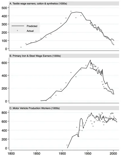 After automation, both textile and iron/steel workers saw employment increase for nearly a century before experiencing a steep decline. Vehicle manufacturing, by contrast, holds steady and hasn’t seen the same steep decline yet.