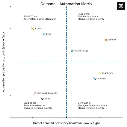 Different industries will experience different outcomes. Unlike what the Jevons optimists suggest, demand for many things plateaus once human needs are met. Employment outcomes in any industry depend on the magnitude and growth of unmet market demand and whether that demand growth outpaces productivity improvements from automation.
